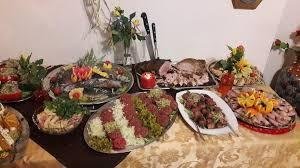 płyty z wędlinami i serami, marynaty, 2 rodzaje sałatek, kawa i herbata (bez ograniczeń), wody, soki i napoje (1 l na osobę), wiejski stół z wyrobami regionalnymi (bez ograniczeń)