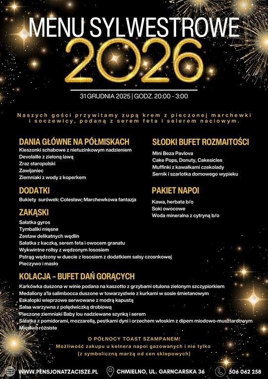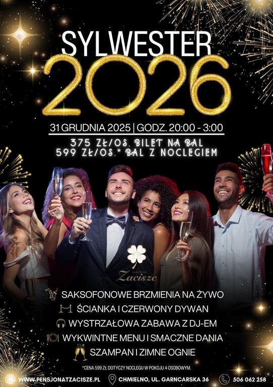 1. SYLWESTER 2026 godz. 20:00-3:00, cena balu z noclegiem 599zł/os