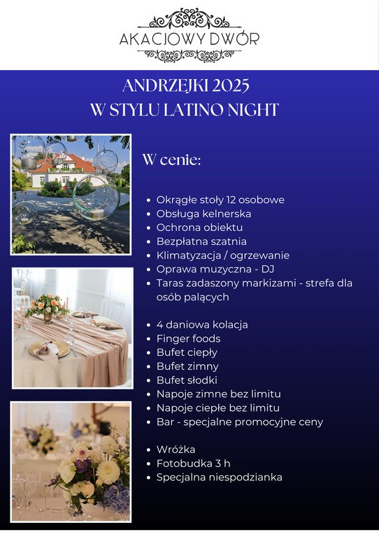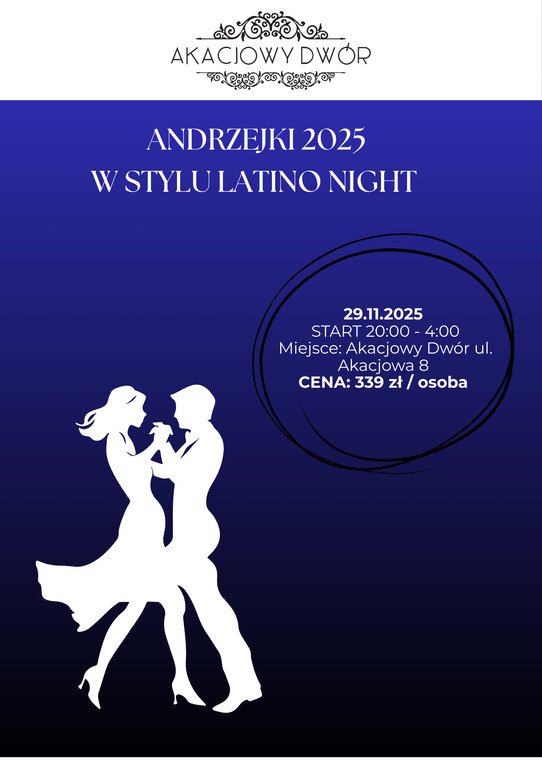 W dniu 29.11 zapraszamy serdecznie na Bal Andrzejkowy w stylu Latino Night. Imprezę poprowadzi DJ Konrad ,,Dolar". Mamy dla państwa niespodzianki.