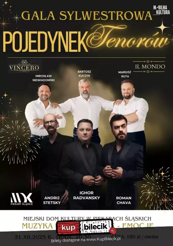 "Wielka Gala Sylwestrowa - Pojedynek Tenorów". Tenorzy Vincero & Tenorzy Il Mondo - 6 głosów, dwie drużyny, jeden wieczór pełen muzycznych emocji! Zapraszamy na niezwykłą Noc Sylwestrową, podczas której sceną zawładnie sześciu charyzmatycznych tenorów - trzech z Polski (Bartosz Kuczyk, Mirosław Niewiadomski, Mariusz Ruta) i trzech z Lwowa (Roman Chava, Igor Radwański, Andrej Stetsky) - by stoczyć pełen pasji, głosu i sztuki pojedynek muzyczny. Dwa zespoły: Tenorzy Vincero oraz Tenorzy Il Mondo zmierzą się w przyjacielskiej, artystycznej rywalizacji, prezentując swoje największe atuty - potężne głosy, sceniczną elegancję i ogromną emocjonalność.